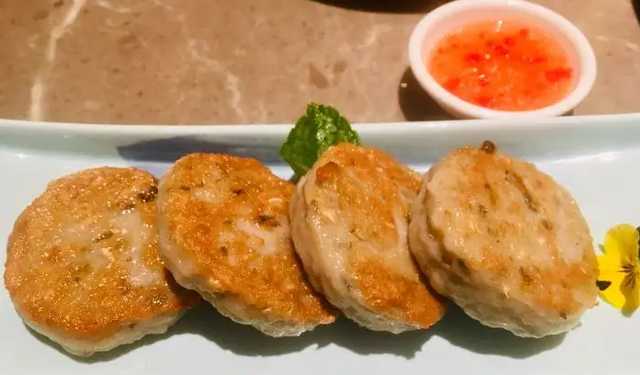 均安煎鱼饼是广东顺德的一道地方名点,它是鲮鱼肉为主要食材搭配上腊肠粒、马蹄粒制作的,煎好的鱼饼为金黄色,甘香爽滑,咬着吃有弹性,鲜美可口。