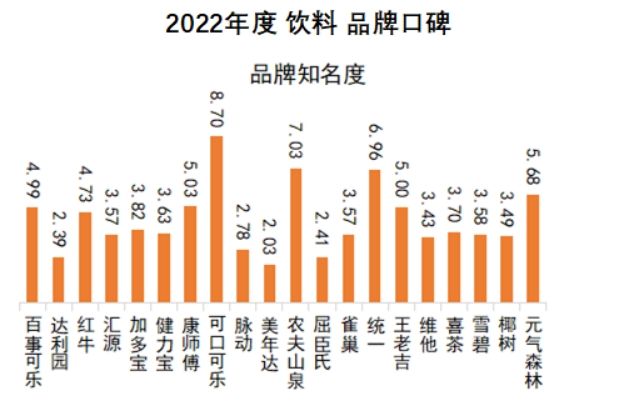 分维度来看:品牌知名度方面,可口可乐、农夫山泉、统一位居前三。可口可乐、农夫山泉、统一、元气森林、康师傅、王老吉、百事可乐、红牛、加多宝在近两期中均位居前十。喜茶在本期晋升至前十,健力宝则掉出前十。