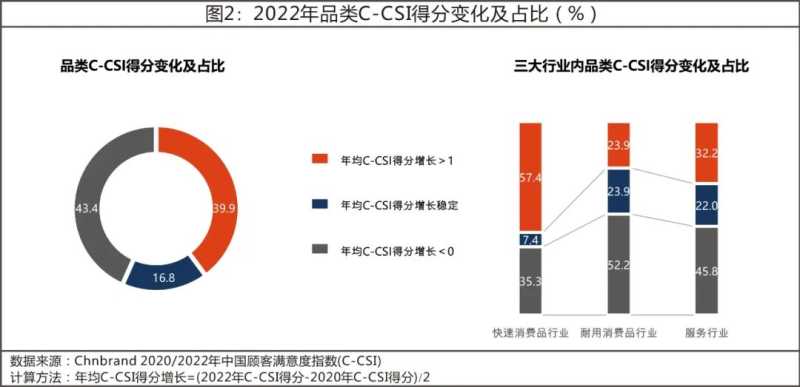 数据显示, 快速消费品行业正表现出前所未有的生命力,从行业内品类的满意度变化来看,57.4%的品类在过去两年C-CSI平均提升幅度在1分以上。