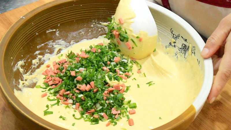 用勺子搅拌一下,排出里面的空气,倒入切好的葱花火腿搅拌均匀。