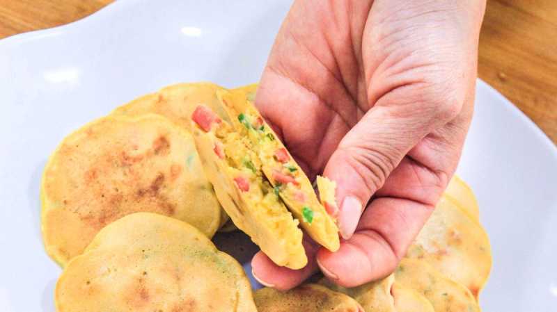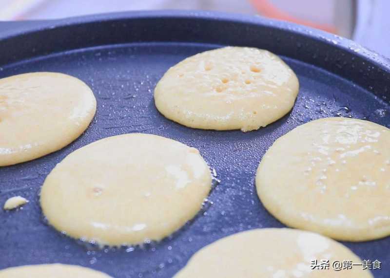 小火烙一分钟左右,玉米饼边缘变色时翻面,翻过来之后再烙一分钟。