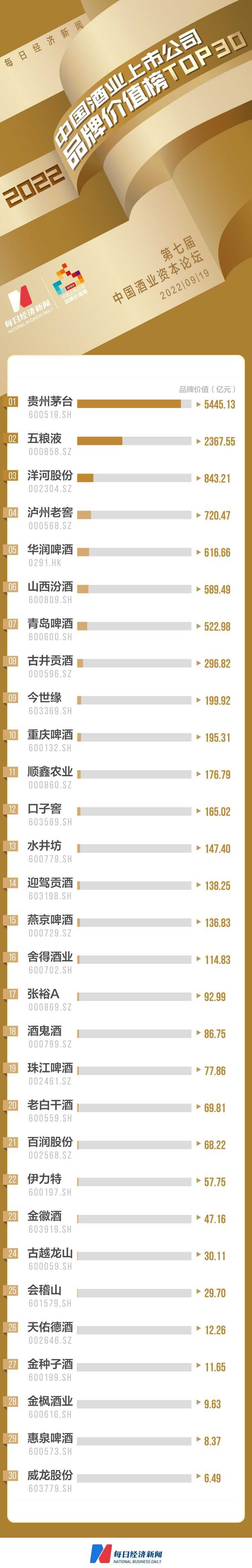 2022中国酒业上市公司品牌价值榜发布:茅台高达5445亿,TOP30企业品牌价值总计13285亿元