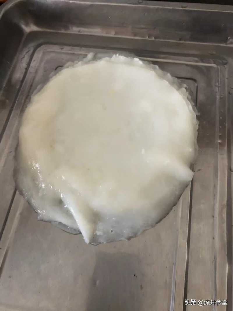 3、盆底刷油,倒入刚搅好的面糊适量上锅蒸3分钟左右,变成透明气泡就可以啦,然后再放入冷水冰一下就可以揭开