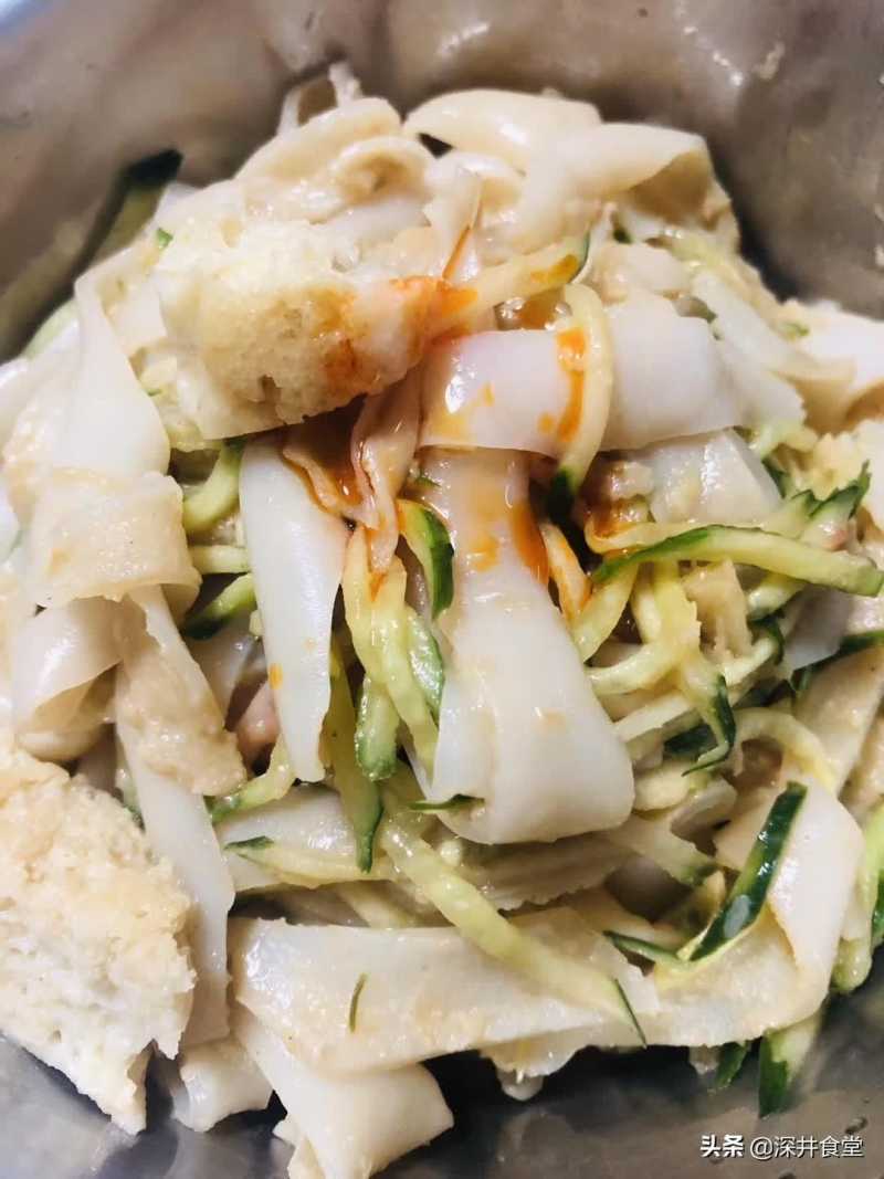 2、锅中放清水,水开后放碱面,煮三至四分钟捞出,放菜板上,放一勺食用油,晾凉