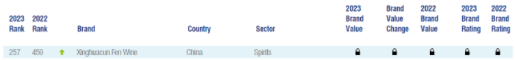 2022全球烈酒品牌价值榜中,汾酒品牌价值约为49.92亿美元,排行全球烈酒第6位。排在茅台、五粮液、泸州老窖、洋河之后。但2023年汾酒在全球烈酒品牌价值排行中跃升3位,排在茅台、五粮液之后,位居全球品牌价值500强第257位。