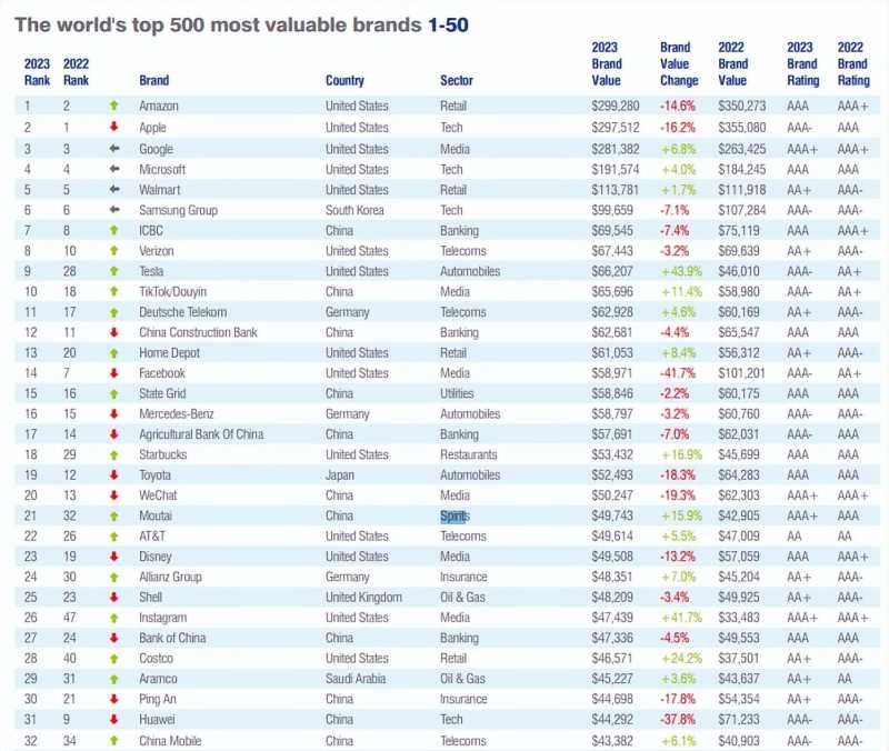 2023 年 1 月 18 日,Brand Finance 发布了2023年全球品牌500强。 报告显示,尽管去年市值蒸发高达510亿美元,但亚马逊依然是全球最具价值品牌;而苹果在亏损576亿美元后失去了第一名,屈居第二;随着电动汽车需求的增长,特斯拉和比亚迪进入全球增长最快的品牌行列。