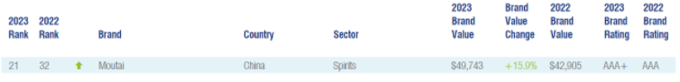 茅台以497亿美元的品牌价值登上榜单第21位,也是上榜中国品牌的第7位。在2022年的榜单中,茅台以429亿美元的品牌价值位列全球第32位,中国第13位;今年茅台品牌价值提升68亿美元,全球排名跃升11位。
