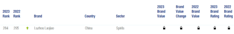 2023年泸州老窖在全球品牌价值排行榜中位居第284位。在全球烈酒排行榜中被汾酒超越,居第四位。