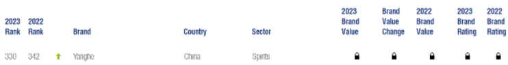 2022年度全球最具价值烈酒品牌TOP10中,洋河股份以64亿美元的品牌价值,荣登榜单第四名。在2023全球品牌价值500强榜中洋河位居全球第330位,在全球烈酒榜单中排在中国的茅台、五粮液、汾酒、泸州老窖之后,位居第五。