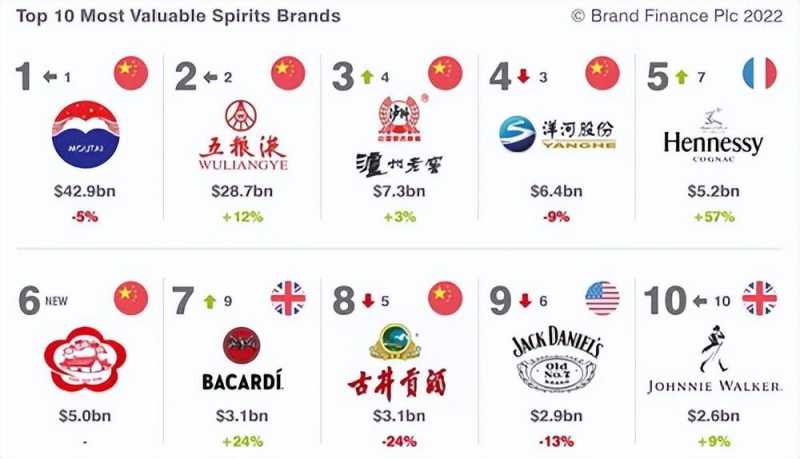 2022年全球最具价值烈酒品牌TOP10分别是:茅台、五粮液、泸州老窖、洋河、轩尼诗、汾酒、百加得、古井贡酒、杰克丹尼、尊尼获加。