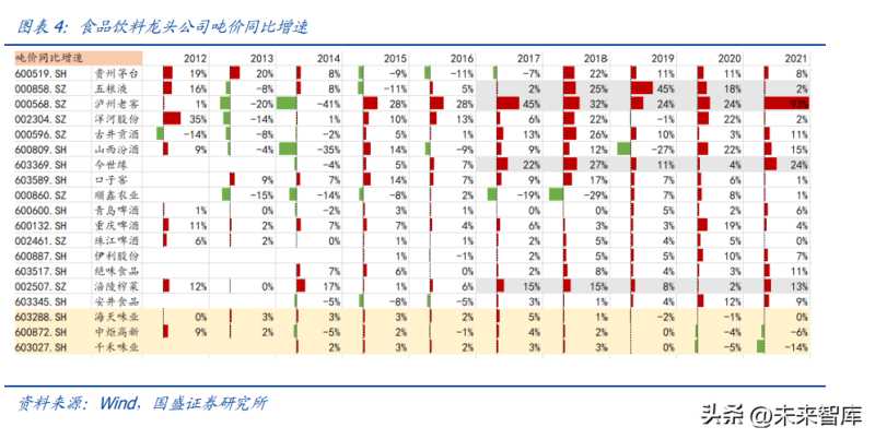 多行业销量降幅收窄,疫情对行业去化影响有限。2016-2019 年白酒、啤酒、酱油行业 规模以上企业产量降幅分别为 42%、16%和 30%,2019-2022 年降幅均有收窄,其中 酱油行业由负转正,说明在疫情三年中,行业并未因为消费场景缺失而显著去化,降幅 的收窄反映出行业在出清后逐步趋于稳定。 白酒龙头价增放缓,啤酒价增提速。白酒龙头茅台 2016-2019 年批价涨幅约 130%, 2019-2022 年涨幅降至 40%左右,虽有降速但增幅依旧领跑行业。啤酒龙头青岛啤酒 2016-2019 年出厂价涨幅约 5%,2019-2022 年涨幅约 15%,反映出啤酒高端化的加速。
