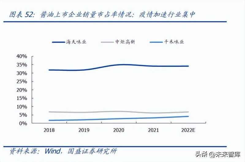 从渠道趋势来看:新渠道兴起,品牌集中趋势不改。2020 年疫情催化社区团购平台发展, 跨界企业进入后 2021 年初期纷纷加大补贴力度引流,造成酱油企业价盘混乱、渠道利 润受损,2021Q2 短期对酱油企业经营造成扰动;随着各企业主动对接平台、政策规范 补贴收窄,当前新兴渠道对酱油行业扰动已边际弱化,长期来看,由于社团平台 SKU 数 少于传统渠道、平台亦需依靠头部品牌引流,酱油品牌集中趋势不改。