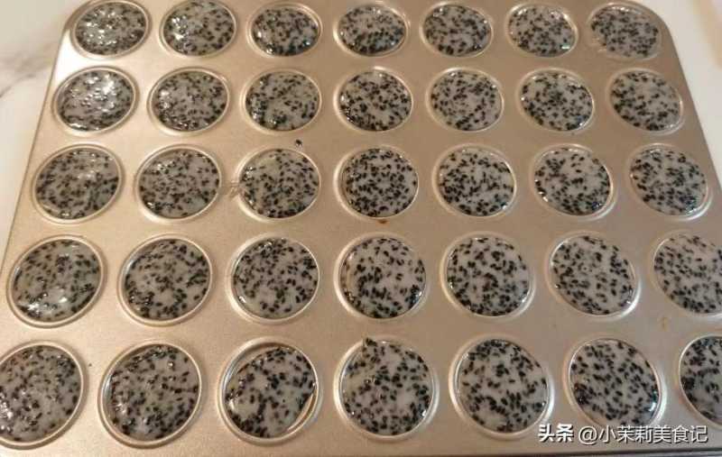 3、将调好的黑芝麻糊装进裱花袋中,然后挤入圆盘中,可以尽量薄一些,这样烤出来口感更酥脆。