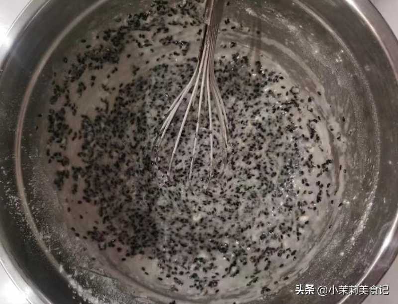 2、接着放入我们的主角黑芝麻,70克左右,再调入40克左右的低筋粉或蛋糕粉,然后继续用蛋抽搅匀。