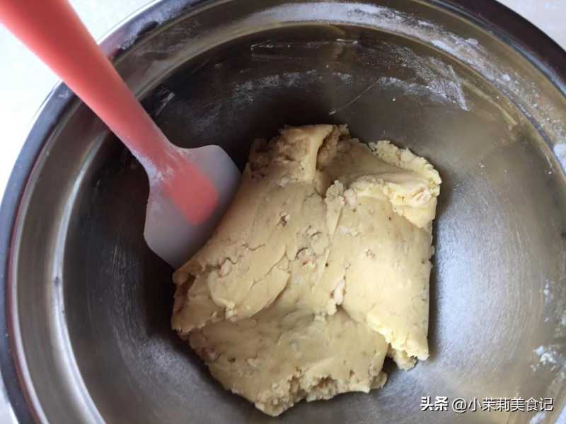 4、把榛子仁放到盆里,再加入200克的低筋粉,进一步用硅胶铲翻拌,直到形成团状。