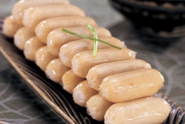 鱼肉香肠是以鱼肉为原材料进行调味,灌装等步骤制成的有着耐贮藏、流通方便、食用简单等特点的美食,因是利用鱼糜制成使得这种香肠相对于其他零食热量相对较低,并带有十足的弹性和浓郁的香味。