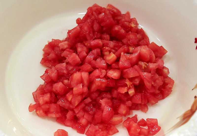 1.准备番茄两个,分别在番茄的上面划上一个十字刀,放在盆中加入开水烫一下外皮,这样容易剥去番茄的外皮,剥去番茄的外皮之后,先切成薄片再改刀切碎,放在盆中备用。