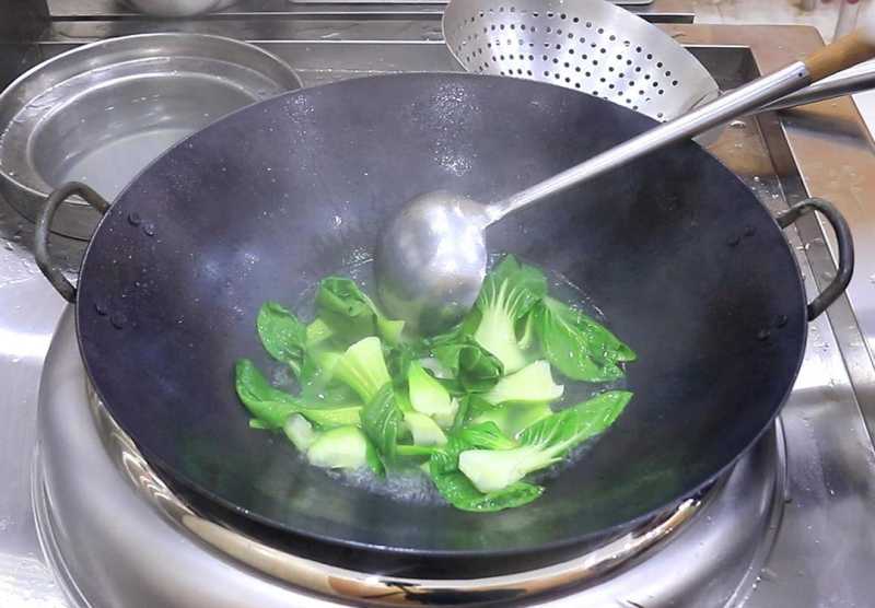 2.先把上海青焯一下水,加入少许食盐和植物油,食盐能够入底味,植物油能防止营养流失,水烧开以后放入上海青,焯烫至上海青变软倒出来控水。