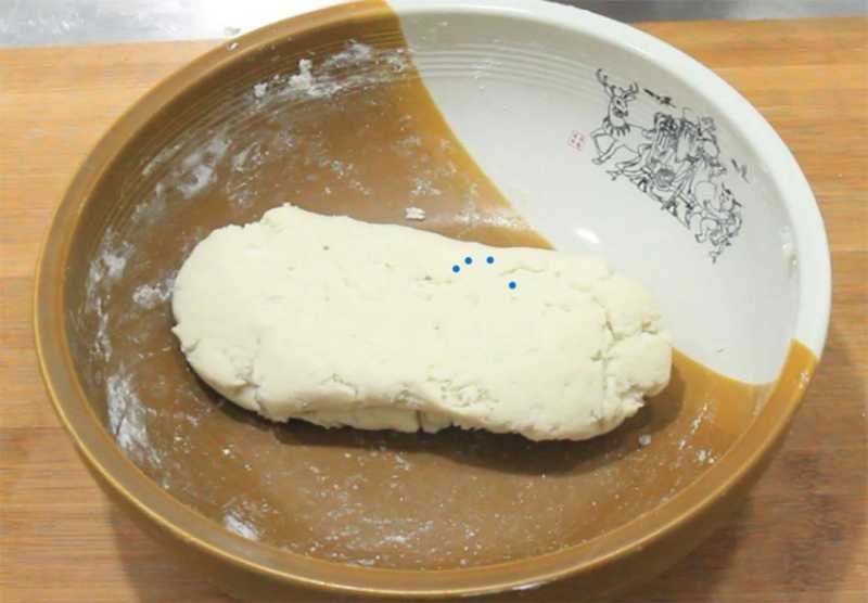 2.15分钟以后把山药取出来放入盆中,用勺子摁压成细腻的山药泥,放在一边晾凉,加入适量的白糖,倒入100毫升牛奶,2勺面粉,3克酵母抓拌均匀,先搅成面絮再和成面团,用盘子盖住发酵2个小时。