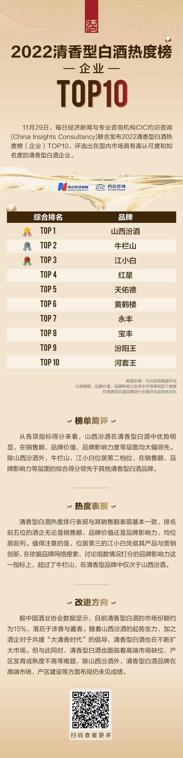 2022清香型白酒热度榜(企业)TOP10出炉,山西汾酒位居榜首