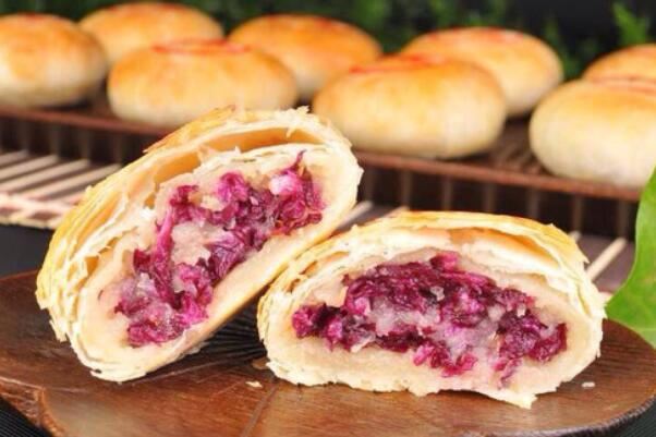 鲜花饼是一种起源于清代乾隆年间的云南传统小吃,以面粉、玫瑰、面粉、猪油、白糖等为主要材料制成,是一款吃起来具有甜而不腻,带有明显花香的具有云南特色的酥到掉渣的经典点心。