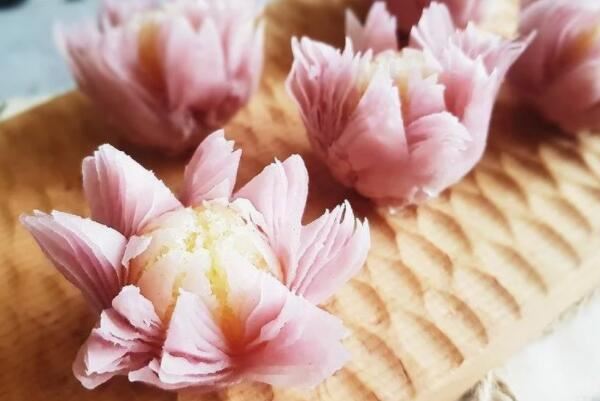 荷花酥是一道花式传统糕点,因外观形似荷花因此成为中式宴席中常见,有着酥层清晰、形美动人、入口酥松香甜,别具风味特点,以油酥包裹着枣泥馅料经过油炸后制成的传统特色甜点。
