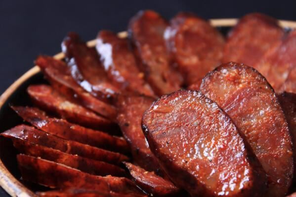 四川腊肠这个以长条状的肉条为原料,并辅以多种调料进行调味后,灌入肠衣进行发酵、成熟、干制等步骤制成的以麻辣为主的肉制品,而这个外表泛着红油油的色泽的腊肠,切开后会闻到扑鼻的辣香味,切面红白相间。
