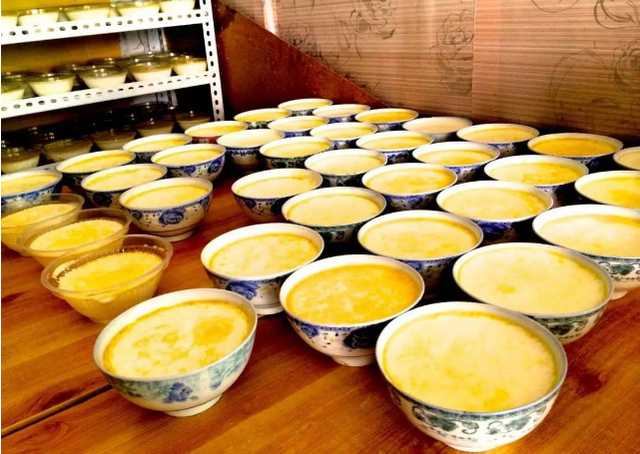 青海老酸奶就是那么的与众不同,它是固态,很像豆腐脑,上边飘有一层金黄色的奶皮,用勺子轻轻一挖,里边就是白嫩的酸奶,带有种独特无法复制的微微酸味和浓郁的奶香味,口感纯正、香醇。