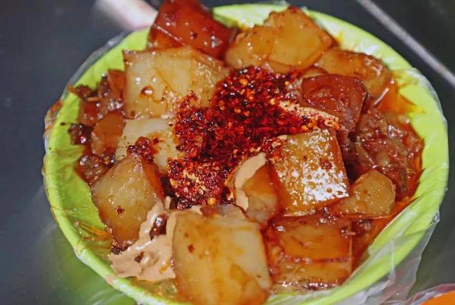 油炒粉是甘肃兰州的十大特色小吃之一,它主要是用卤猪油去炒凉粉,加入糖色、葱花、盐等,炒至凉粉金黄滚烫,炒好之后根据个人口味去调料即可食用,吃到嘴里,油滑爽口,醇香酸辣。