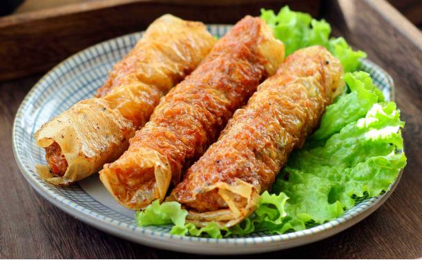 用五香卷搭配上卤面是当地人吃卤面的正确打开方式,五香卷是用豆皮卷上荸荠、瘦肉、葱、扁鱼等馅料,包裹成春卷一样,炸的外皮酥脆,内陷润滑甜美。