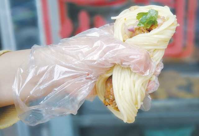 手抓面属于福建漳州、安溪的民间特色小吃,因为是用手抓着吃的,所以出名,面是黄橙橙的碱面,吃到嘴里又软又韧,上边浇上芥末酱、沙茶酱、辣椒酱、花生酱等,再搭配上油炸豆腐干丝,吃着甜中有酸,令人食欲大开。