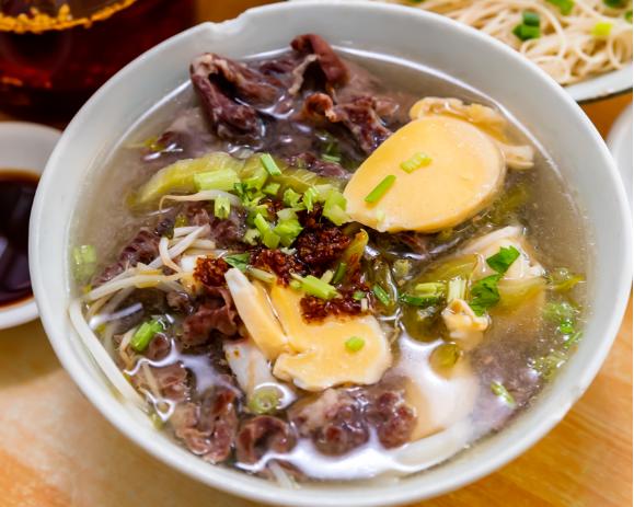 漳州卤面和河南地区的卤面可是完全不一样的,在当地街道的排档就能吃到,面主要用的是加了碱的粗面,咬着清爽弹牙,卤汤鲜甜,里边还有虾仁干,细腻的肉末和脆口的黄花菜,以及香菇、干贝、鱿鱼须、猪皮、蛋花等佐料。