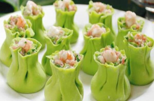 翡翠烧麦是扬州的名小吃之一,烧麦的皮是用面粉和菠菜汁制作的,皮薄如纸,色如翡翠,內馅是用青菜、猪油和白糖等食材制作的,吃起来十分清香可口。