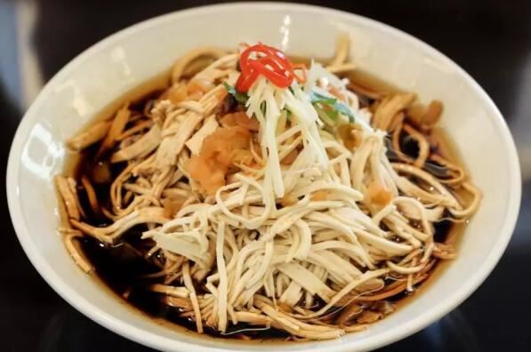 扬州烫干丝是江苏扬州和泰州一带非常流行的传统小吃,是将当地特制的豆腐干切成薄片,再切成细丝,用开水烫熟后捞出加入配料浇上卤汁即可,味道十分可口。