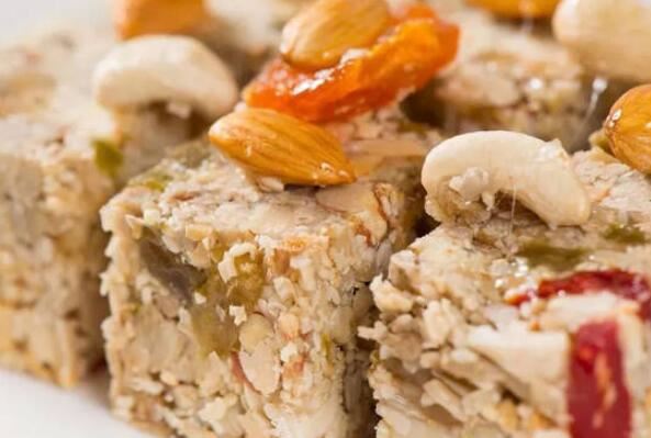 玛仁糖也叫切糕,是新疆维吾尔族的特色小吃,是以核桃仁、玉米饴、葡萄干、芝麻、红枣等原料采用当地传统特色工艺制作的,不仅外观色泽鲜艳,而且味道可口,营养丰富。