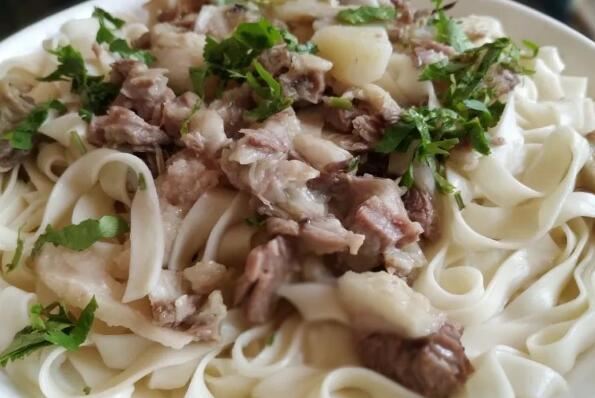 那仁是新疆哈萨克族的传统美食,一般是以马肉或羊肉为主要原料,将肉煮熟后将肉和肉汤一起倒入煮好的皮带面上,再加入洋葱一起搅拌着吃,味道十分独特。