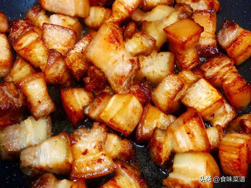 1、准备一块五花肉,改刀切块,下锅焯水去腥,放葱姜料酒,捞出冲洗干净,控干水分, 起锅烧油,先干煸出五花肉的肥油,这样口感会更干爽。