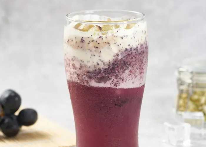 而对于这款芝士葡萄奶盖来说,它主要是以芝士奶盖,新鲜紫葡萄,当天冲泡的毛峰茉莉绿茶作为原料根基,清爽、甜香、奶味芬芳,整体的质感让人甚是陶醉,只需简单几口就能感受到这款茶饮的独特风姿。