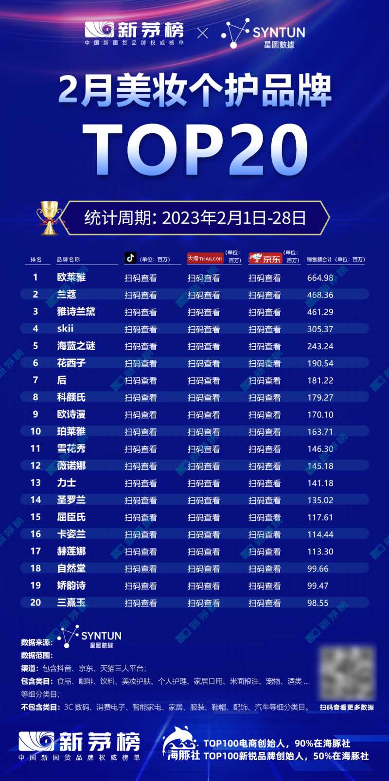可以明显看出,以欧莱雅、兰蔻、雅诗兰黛为代表的美妆个护上榜品牌数量最多,共计有37家,其中值得关注的国货美妆品牌有花西子、自然堂、hbn,花西子2月销售额只逼2亿,领航国货美妆赛道。