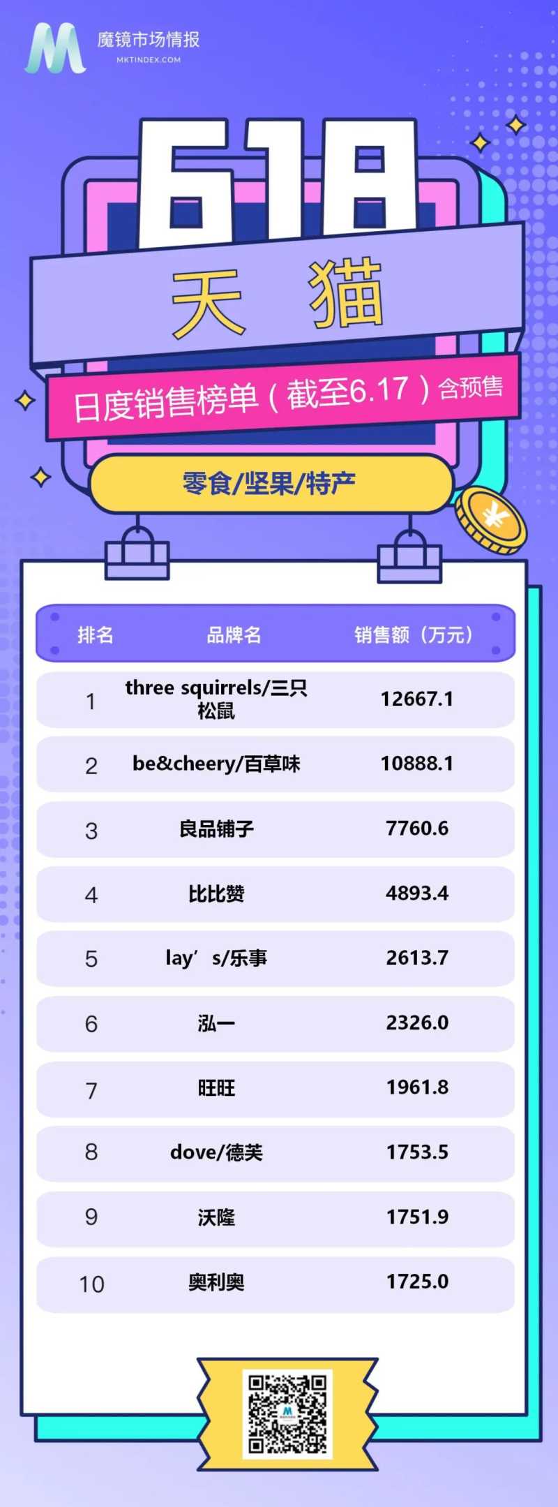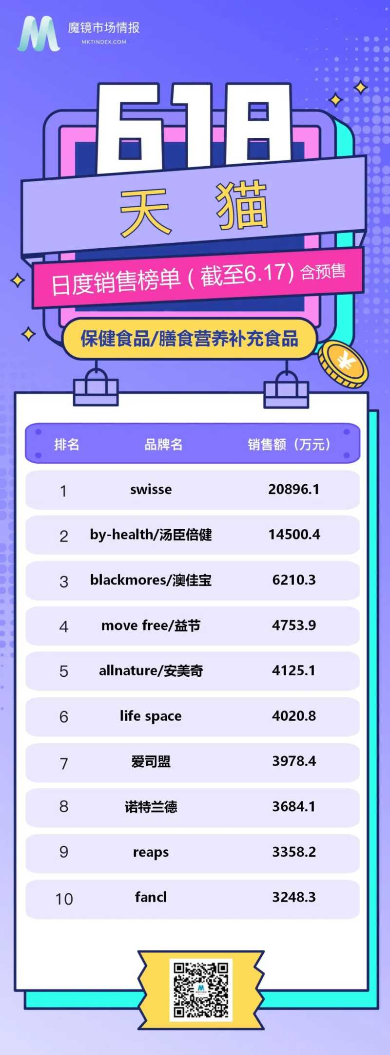 今天,魔镜市场情报为大家盘点一下食品饮料、医药保健行业中,天猫平台截至6月17日累计销售额品牌排行(含预售)。