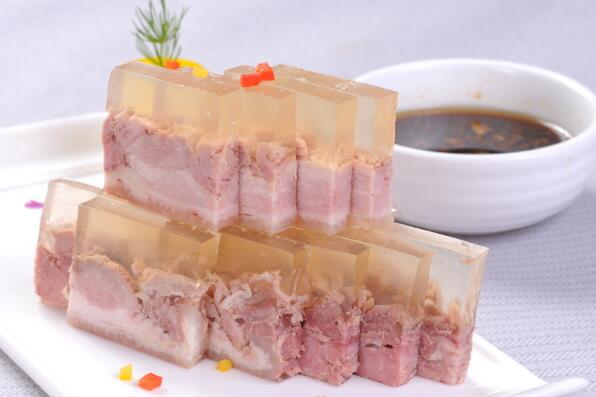 水晶肴蹄也叫水晶肴肉,是源自江苏镇江的传统名菜,是以猪蹄为主要食材,辅以葱、姜、黄酒等多种佐料制作而成的,成菜形态美观,晶莹透明,犹如水晶。