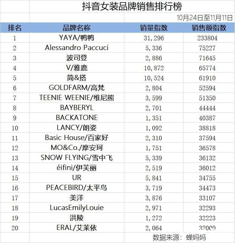 蝉妈妈数据显示,女装类目下,销售额排前三的品牌依次是鸭鸭、Alessandro Paccuci和波司登。上榜品牌中,有不少是红人品牌,如第二的Alessandro Paccuci,第五的简&搭,第九的BACKATONE,以及第十七的美洋等。其中,排第二的Alessandro Paccuci是一家抖音电商平台成长起来的服饰品牌。