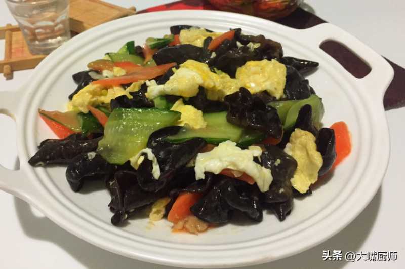1、黄瓜洗干净,切成薄片。木耳用清水泡发,洗干净后去根。鸡蛋打入碗中,加入食盐搅拌均匀。起锅烧油,六成热时倒入鸡蛋液,大火煎至定型后炒出大块,盛出备用。