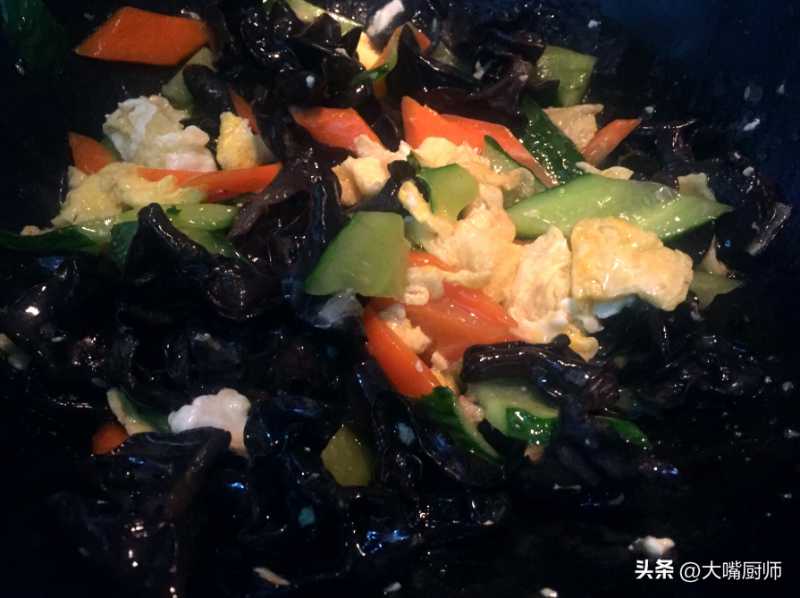 2、香葱切葱花,锅里留底油,放入葱花爆香,倒入木耳快速翻炒1分钟,断生后倒入黄瓜片,继续翻炒1分钟,木耳炒熟后加入适量食盐调味,倒入鸡蛋块翻炒均匀即可出锅。