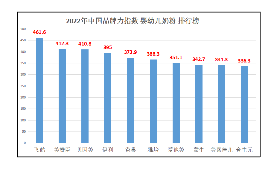 婴幼儿配方奶粉品类的排行榜TOP3依次是:飞鹤、美赞臣、贝因美。相较去年来讲,飞鹤超越美赞臣成为榜单冠军,以461.6分远超其余品牌,贝因美进入前三。