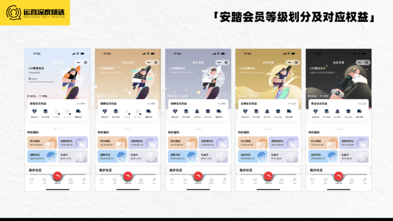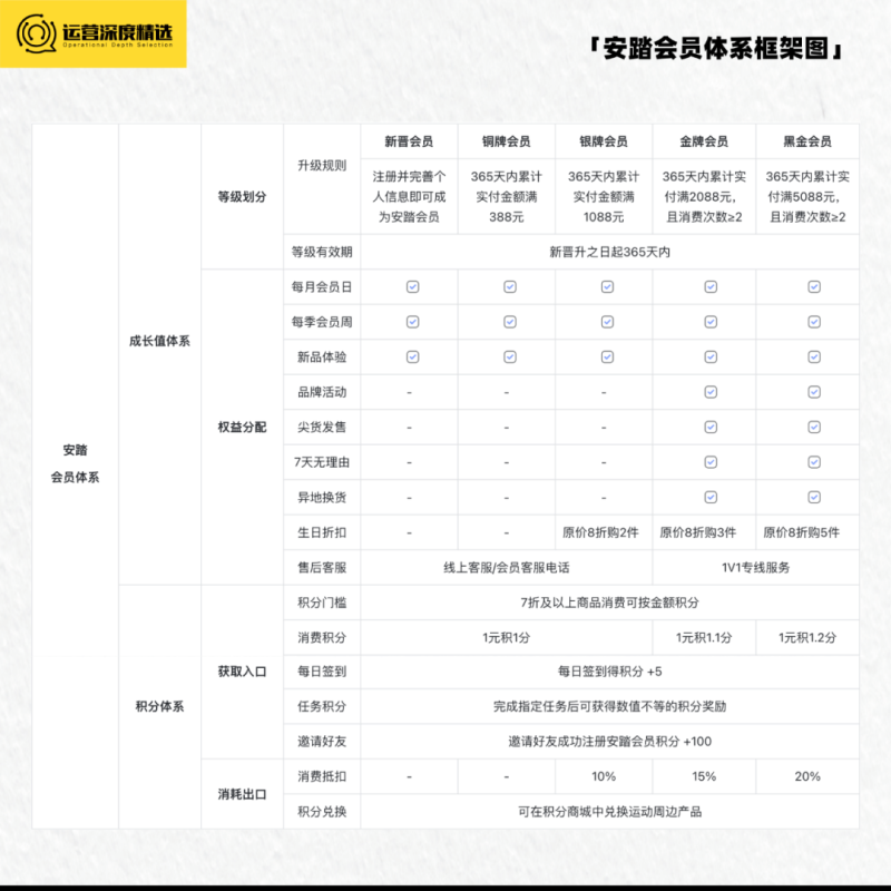 成长体系:安踏会员分为新晋会员、铜牌会员、银牌会员、金牌会员以及黑金会员5个等级,通过累积消费金额来实现晋升,且有消费次数的限制。对应的会员权益包括会员日/周活动、新品体验、尖货发售、生日折扣等,不同会员等级在权益折扣上会逐级递增。