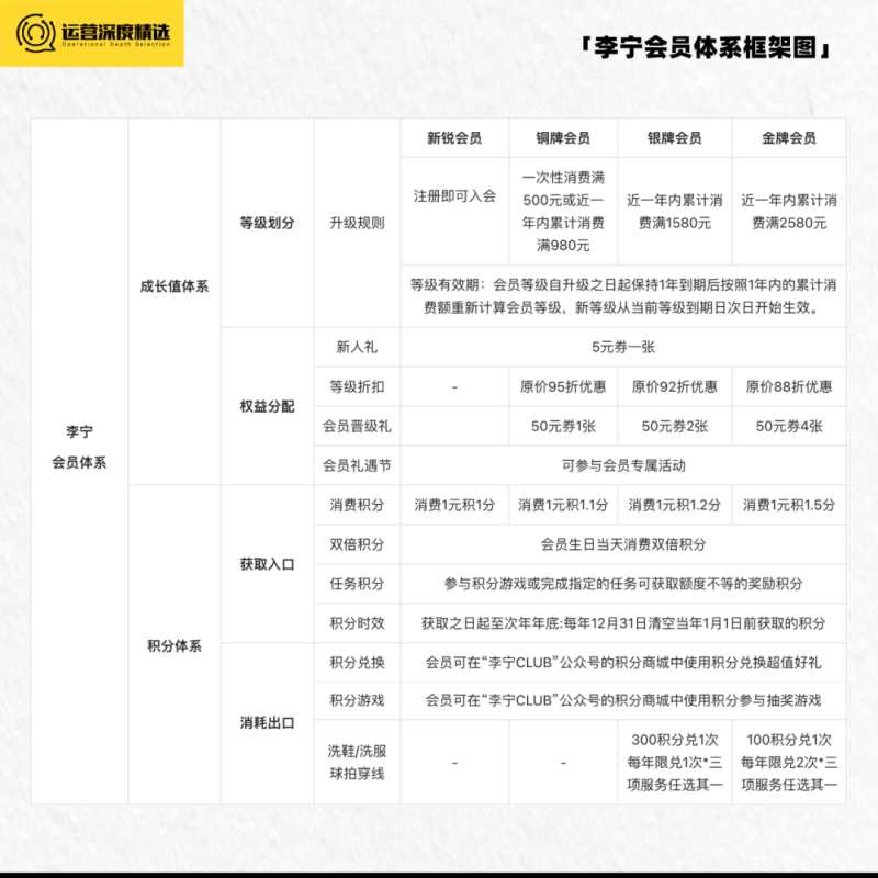 在拆解完安踏、李宁、耐克、阿迪达斯等会员体系后,从横向对比以及跨行业对比可以发现不同的会员体系特性,具体来看: