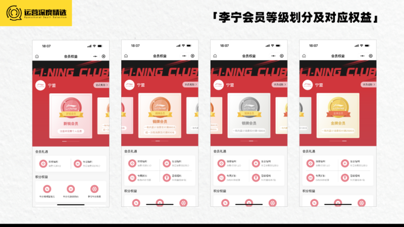 成长体系:李宁的会员共有4个等级,分为新锐会员、铜牌会员、银牌会员和金牌会员。你会发现运动品牌通常都爱用金、银、铜来区分等级,这也和运动竞技的属性密不可分。会员等级的晋升同样是根据一年内累积的消费金额来评定,但相比安踏少了消费次数的限制。对应的会员权益简单明了,主要是新人礼、等级折扣、晋级礼包等折扣券,以消费向的权益主导。
