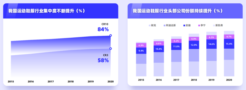 在运动鞋服领域,产品的研发周期和技术壁垒导致后来者想要进入并后来居上相当地难。因此相比其他细分服饰类目,运动鞋服的集中度也高得离谱。