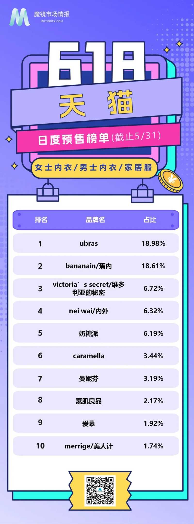 今天,魔镜市场情报将为大家盘点一下运动户外、服饰鞋包行业中,天猫平台截至5月31日累计预售额品牌排行。